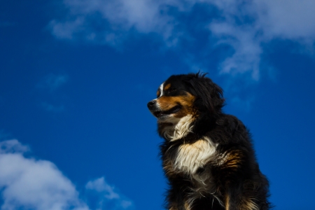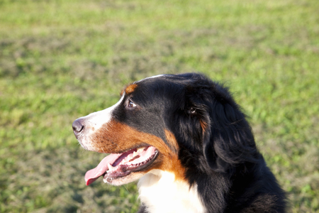 Cute happy dog portrait in spring sunny day. Bernese mountain dog