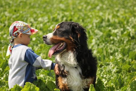 Small children in a large meadow and with large trees, a small person in a big world, children and nature, freedom in nature with Bernese mountain dog