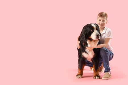 The girl with the pet. Bernese mountain dog in nature . Sunny day