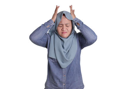 Portrait of Asian muslim lady wearing hijab hold her head in pain for having headache, isolated on white