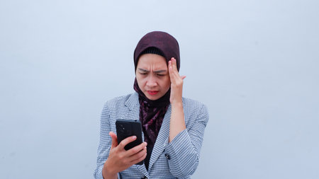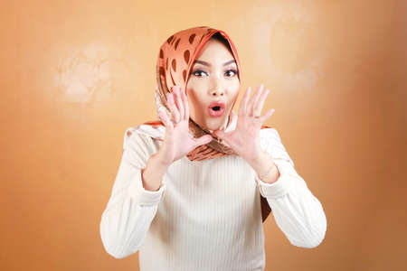 Young Asian Islam woman wearing headscarf is shocked.