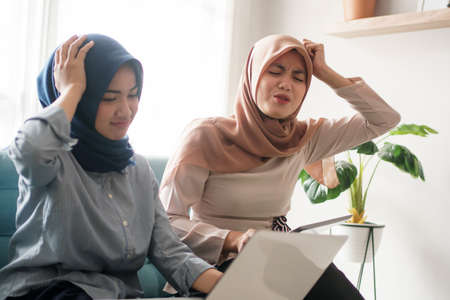 Portrait of muslim businesswoman wearing hijab shocked stunned when looking at laptop, bad negative news concept