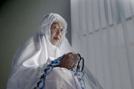 Portrait of senior woman praying while holding rosary beads