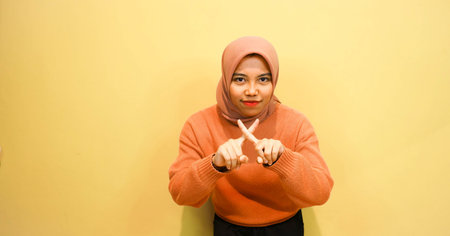 Portrait of beautiful asian muslim woman wearing hijab showing stop gesture on orange background