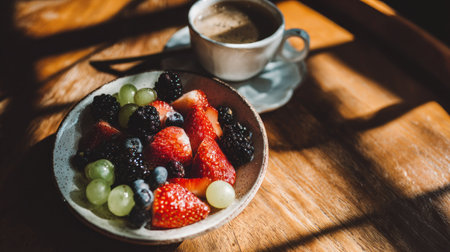High-angle, view focuses on a rustic ceramic bowl filled with freshly cut strawberries, whole blackberries, blueberries, and green grapes, positioned next to a white ceramic cup containing a dark beverage, possibly coffee, resting on a richly textured wooden surface, with strong directional sunlight casting dramatic shadows across the scene.