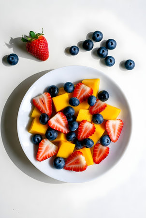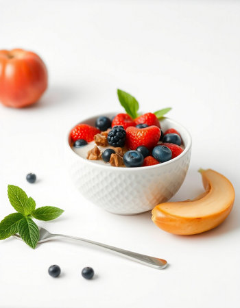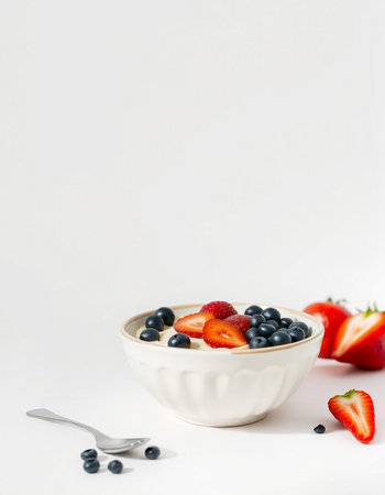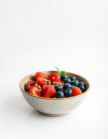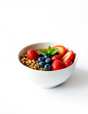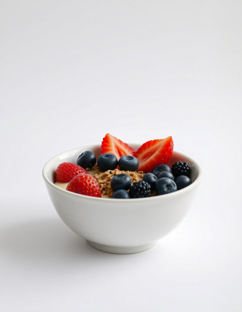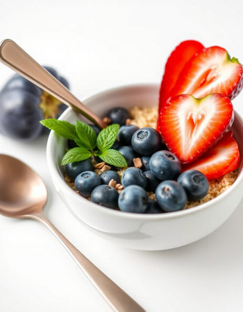 Muesli with strawberries and blueberries in a white bowl on a white background