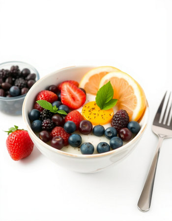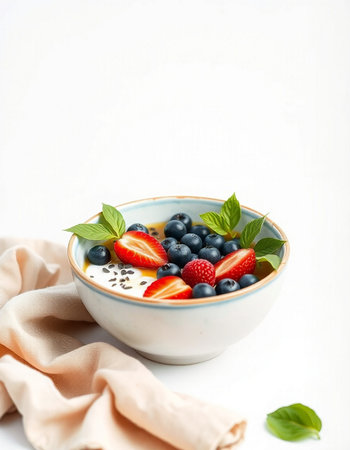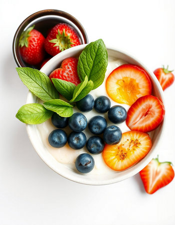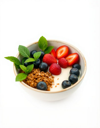 bowl of yogurt with fresh berries isolated on white background, healthy breakfast