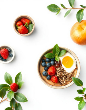 Healthy breakfast bowl with oatmeal, fresh berries and egg on white background. Top view