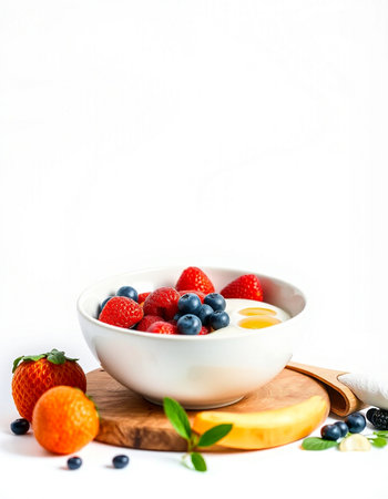 Healthy breakfast with yogurt, berries and fruits on a white background