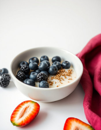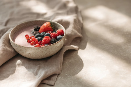 Fresh strawberries, blueberries, and blackberries accompany oats in a coconut shell bowl, placed on a linen cloth. the marble surface and natural lighting emphasize the rustic, wholesome aesthetics of the breakfast. Generative AI