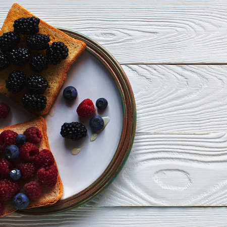 A delightful slice of toast topped with fresh berries and creamy frosting sits on a rustic wooden table, perfect for breakfast or brunch.