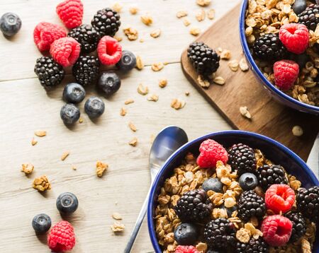 Healthy breakfast. Oatmeal with blueberries, strawberries and granola on white background.