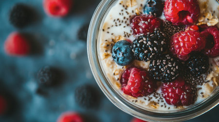 A close-up of a jar of overnight oats, layered with chia seeds, yogurt, and berries, ready for breakfast.