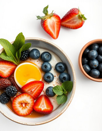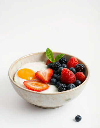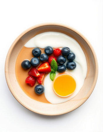 Healthy breakfast with yogurt, berries and fried egg on white background
