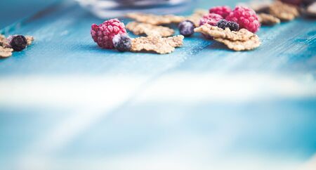 Close up Cereal bowl with milk, blueberries and strawberries. Gastronomic concept