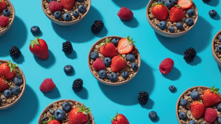 Vibrant bowls filled with various fresh berries and granola set against a bright blue background, showcasing a healthy and attractive dessert option perfect for nutrition enthusiasts.