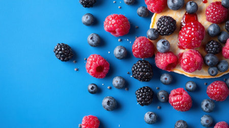 A vibrant arrangement of fresh raspberries and blueberries on a cake plate set against a bright blue background, perfect for food photography enthusiasts.
