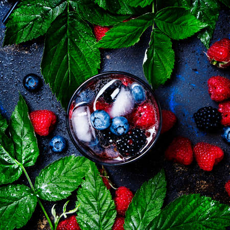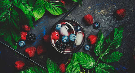 Berry iced cocktail with vodka, juice, soda, blueberry, blackberry and raspberry, top view