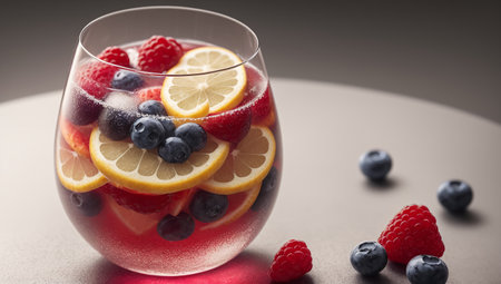 Close-up of a fruity sangria with orange slices and berries