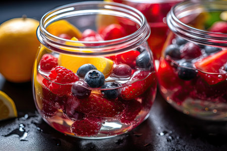 close-up of crystal clear fruit-infused water with visible fruit pieces, created with generative ai