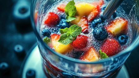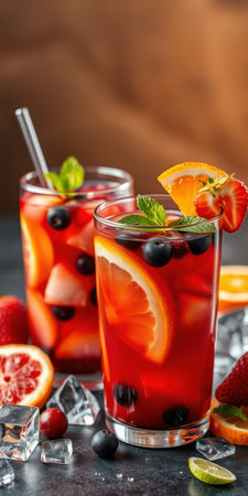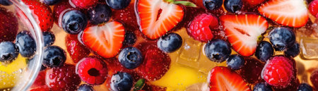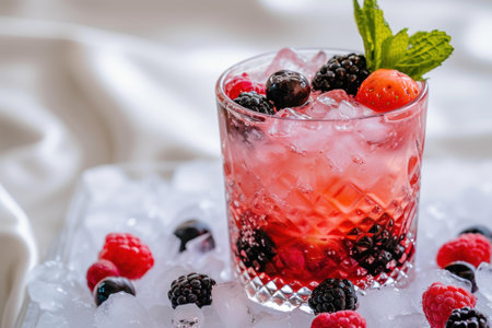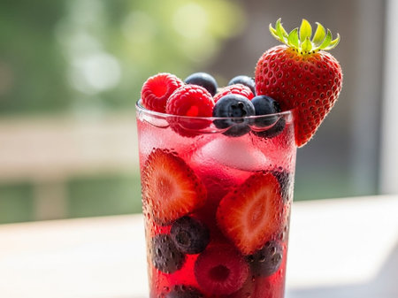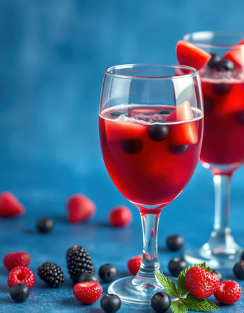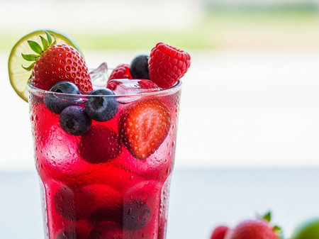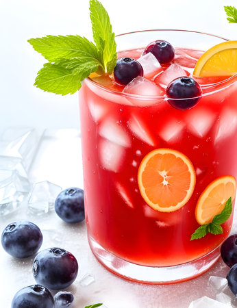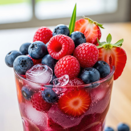 This image showcases a vibrant fruit beverage with a mix of berries and ice. The composition highlights the red and blue hues of the fruits. It could be used in various commercial projects to illustrate freshness, refreshment, or health, such as in advertisements and editorial content.