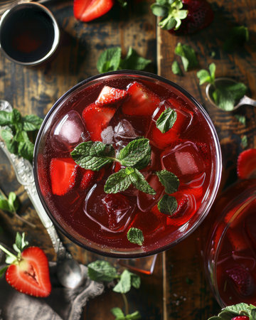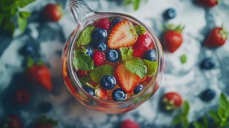 This top-down shot showcases a refreshing berry infusion, featuring strawberries, blueberries, and mint. Perfect for summer gatherings or health-conscious choices.