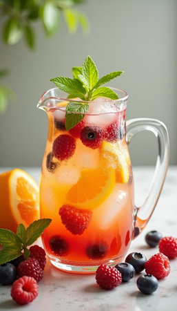 Glass pitcher full of refreshing summer drink with raspberry, lemon, orange and mint