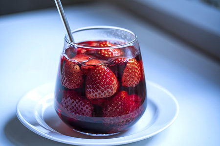 A photo of a sweet refreshing berry compote of ripe strawberries in a glass