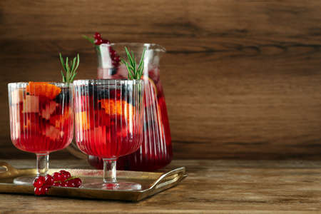 Glasses and jug of Red Sangria on wooden table. Space for text