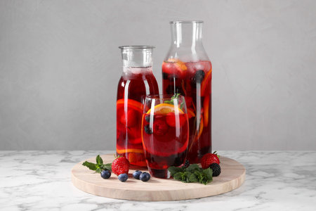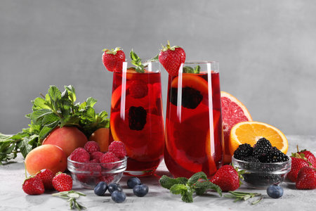 Delicious refreshing sangria with fresh fruits and berries on light gray table