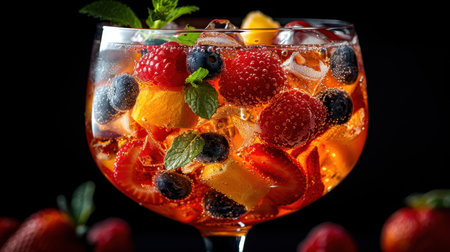 Close up of fruit cocktail with berries and orange slices on dark background