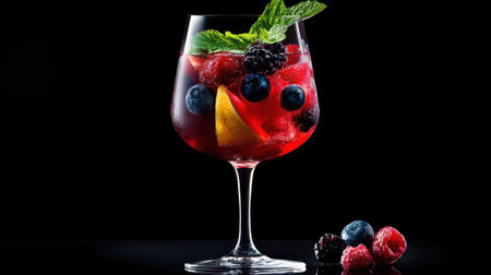 Bright and refreshing mixed berry cocktail served in a crystal glass with mint leaves on a dark background