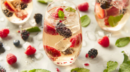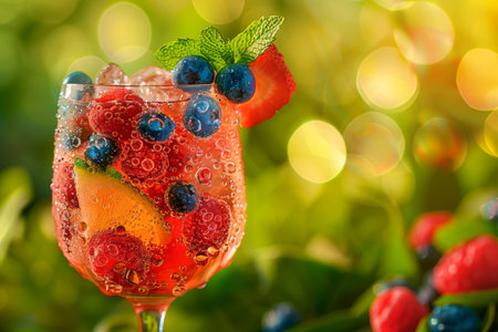 A colorful glass brimming with fresh raspberries, blueberries, and mint leaves sparkles with bubbles. Sunlight filters through the green foliage, creating a delightful summer ambiance.