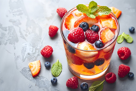 Refreshing berry cocktail with strawberries, raspberries, blueberries, and mint in a glass on a gray surface.
