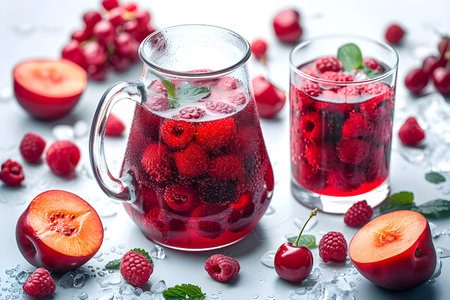 Refreshing berry and fruit drink with raspberries, cherries, and plums in a glass pitcher and cup, surrounded by fresh fruit and ice.