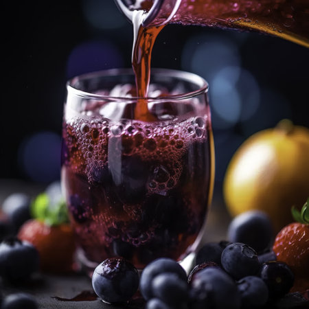 Fruit juice pouring into a glass with fresh fruits and berries.