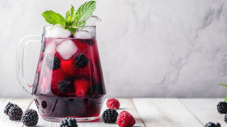 A glass pitcher of blackberry detox water, with mint leaves and ice floating on top, placed on a white wooden table with a copy space background