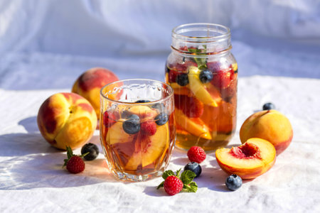 A vibrant jar filled with fresh fruits, including citrus slices and berries, offers a refreshing summer drink perfect for outdoor gatherings and celebrations.