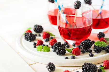 Summer beverage with raspberry and blackberry on white wooden table. Soft focus