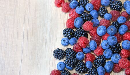 Mix of fresh berries on wooden background, blueberry, raspberry, blackberry