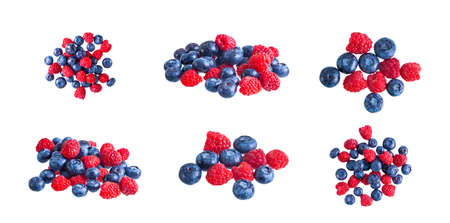 Healthy fresh food. Different berries collage set. Macro shots of fresh raspberries, blueberries, blackberries, strawberries, red currant and blackberries with leaves isolated on white background.
