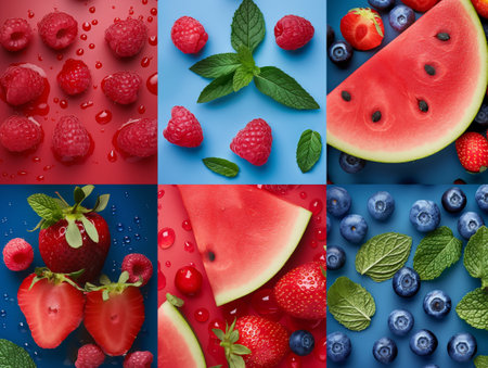 A vibrant collage featuring raspberries, strawberries, blueberries, watermelon slices, and mint leaves on colorful backgrounds