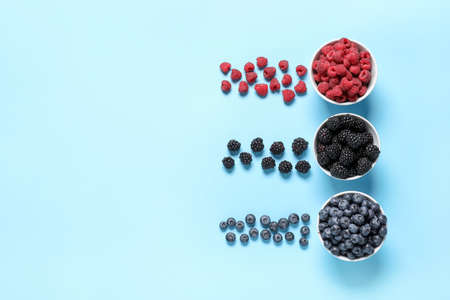 Various fresh berries on neutral background. Organic valuable food source. top view, copy space