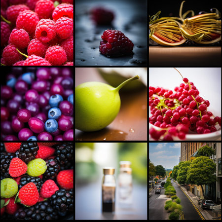Berries products collage with white vertical lines bright white light, minimum 7 segments