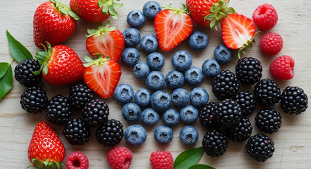 Assortment of fresh ripe strawberries blueberries raspberries and blackberries scattered on a light wooden surface.