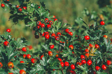 Red ripe berries of hawthorn branches with dark green leaves. In the rays of the evening autumn sun.