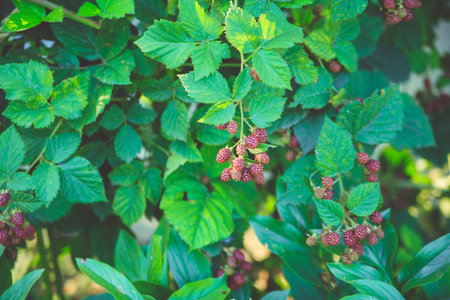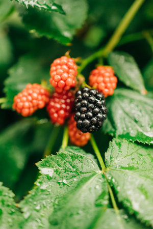 Ripe and unripe fruits of Rubus fruticosus on green foliage