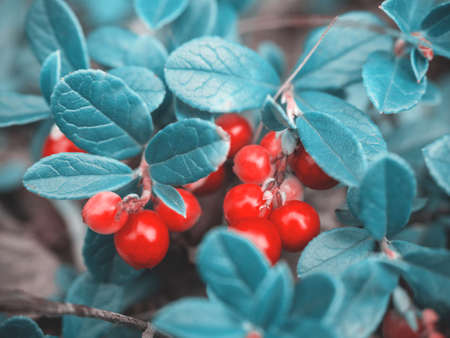 Bush with lots of red berries on branches, autumnal background. Close-up colorful autumn wild bushes with red berries and cold green leaves in the park. Shallow depth of field
