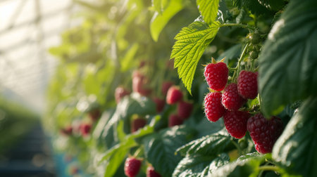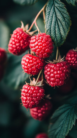 Clusters of ripe raspberries are suspended from a green branch, showing vibrant red color amidst lush greenery on a sunny summer day, reflecting natures bounty and freshness.