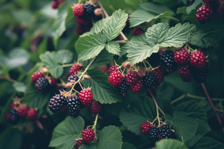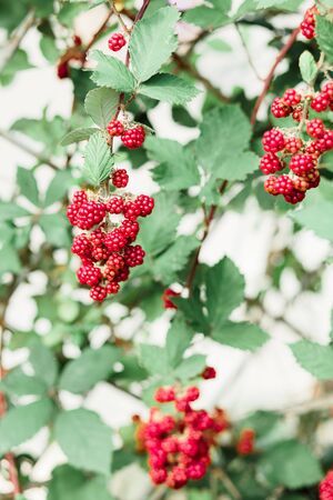 Bright red and ripe blackberries hang from green foliage in a garden, showcasing the beauty of summer fruits.